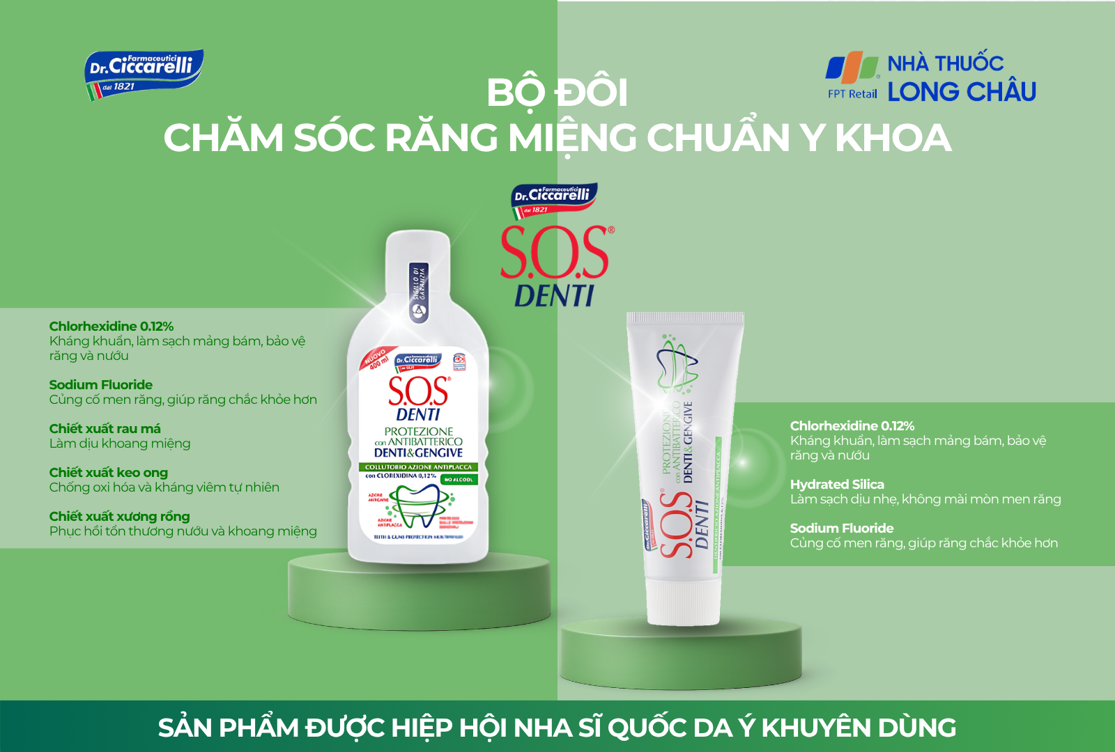 Hiện sản phẩm Nước súc miệng giảm mảng bám, bảo vệ răng và nướu S.O.S Denti Mouthwash With Chlorhexidine 0,12% đã có mặt tại chuỗi nhà thuốc Long Châu (tham khảo thêm tại đây) và các chuỗi nha khoa lớn.