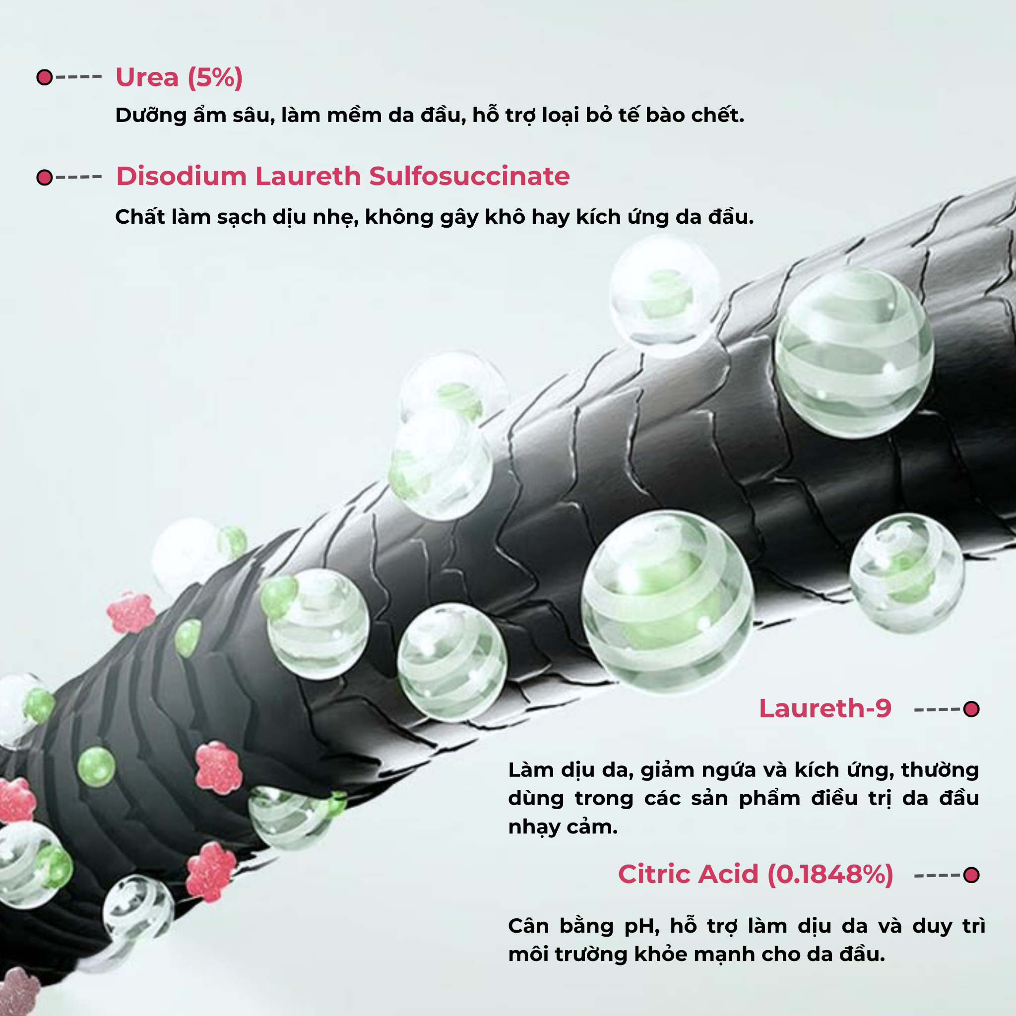 Laureth-9: Làm dịu da, giảm ngứa và kích ứng, thường dùng trong các sản phẩm điều trị da đầu nhạy cảm.