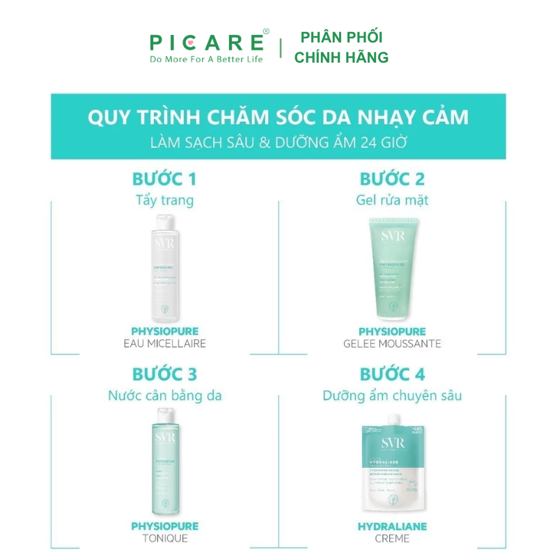 SVR Physiopure Eau Micellaire là nước tẩy trang dành cho mọi loại da, đặc biệt là da nhạy cảm. Sản phẩm làm sạch hiệu quả lớp trang điểm, bụi bẩn và bã nhờn mà vẫn giữ lại độ ẩm cần thiết cho da. Với công thức dịu nhẹ, không chứa xà phòng, cồn, Paraben hay chất tạo màu, đây là lựa chọn lý tưởng cho làn da dễ kích ứng. Sản phẩm hiện được phân phối chính hãng bởi Picare Việt Nam.