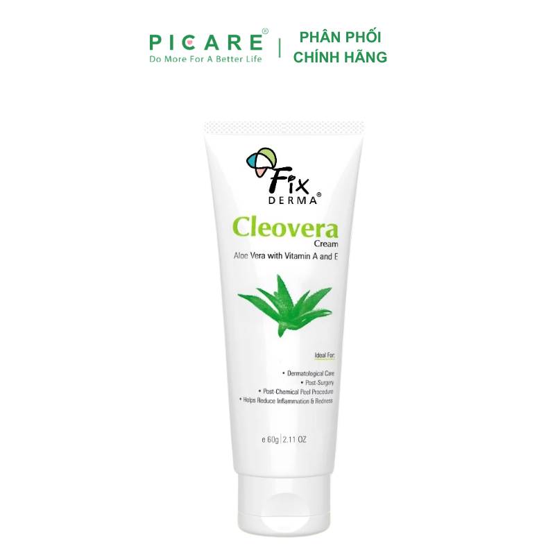 Kem Dưỡng Ẩm Làm Mềm Da Fixderma Cleovera Cream 60g với sự kết hợp độc đáo giữa Aloe Vera + Vitamin A và E, giúp làm đầy và mềm da. Khả năng giữ ẩm cao giúp làm dịu và làm lành da khô, nứt, mẩn ngứa,… Da hăm nóng do tả lót. – Picare là nhà phân phối chính hãng của FIXDERMA tại Việt Nam.