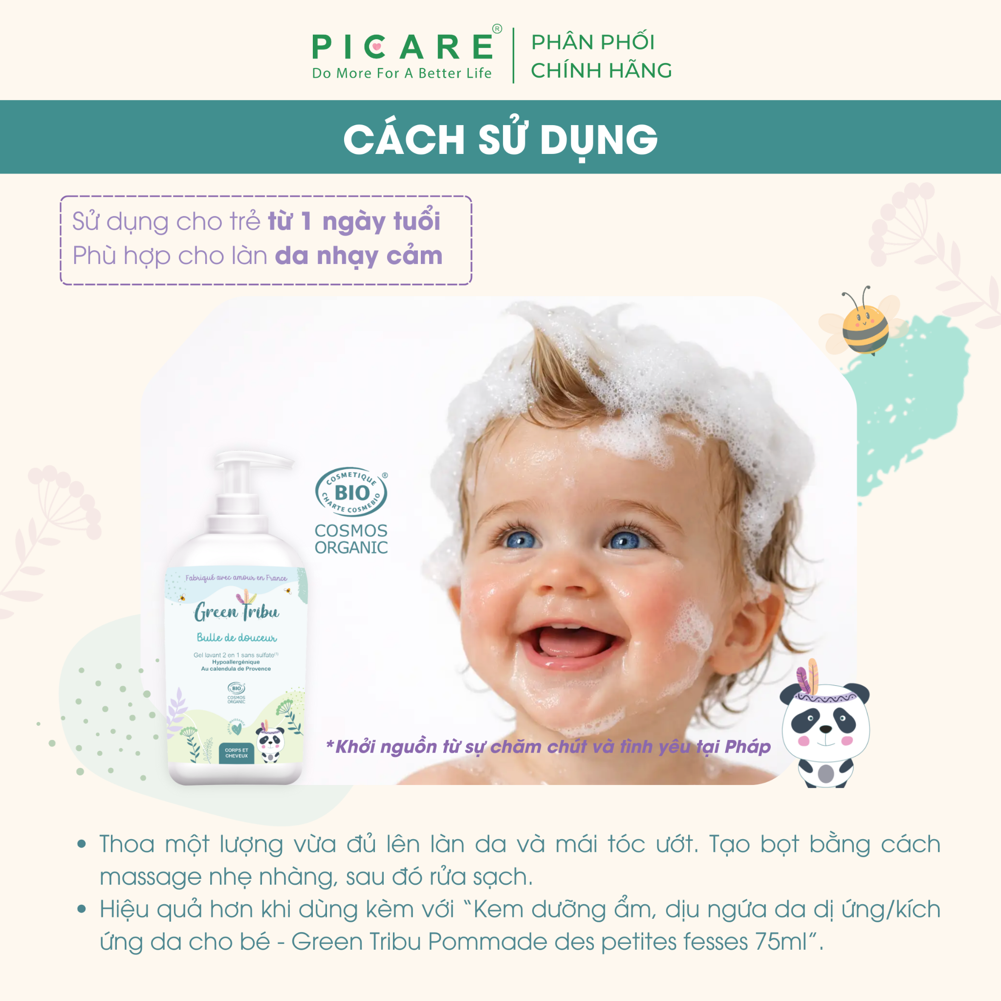 - Hiệu quả hơn khi dùng kèm với “Kem dưỡng ẩm, dịu ngứa da dị ứng/kích ứng da cho bé - Green Tribu Pommade des petites fesses 75ml”.