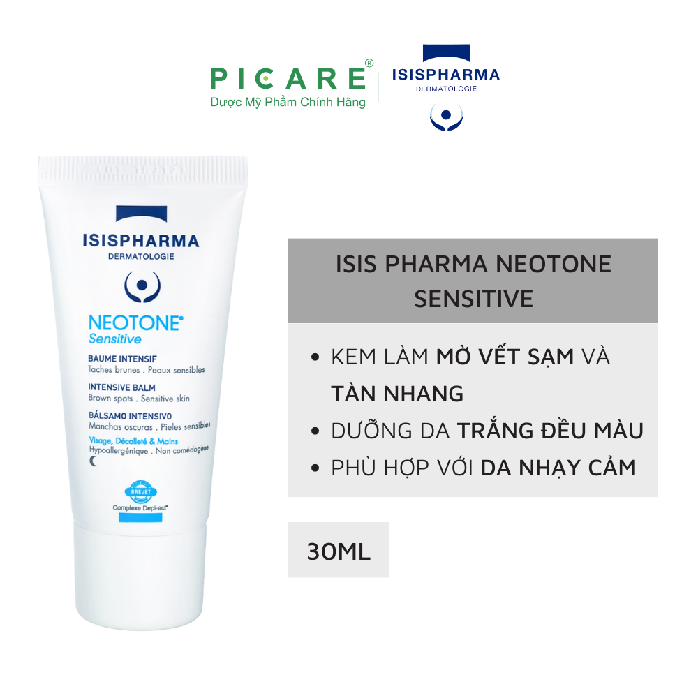 Kem dưỡng trắng & hỗ trợ trị sạm da, tàn nhang Neotone Sensitive của Isis Pharma là sản phẩm chuyên biệt dùng cho da bị sạm màu, tàn nhang và tăng sắc tố sau viêm. Sản phẩm dùng chăm sóc, làm đẹp da vào ban đêm