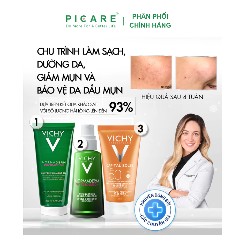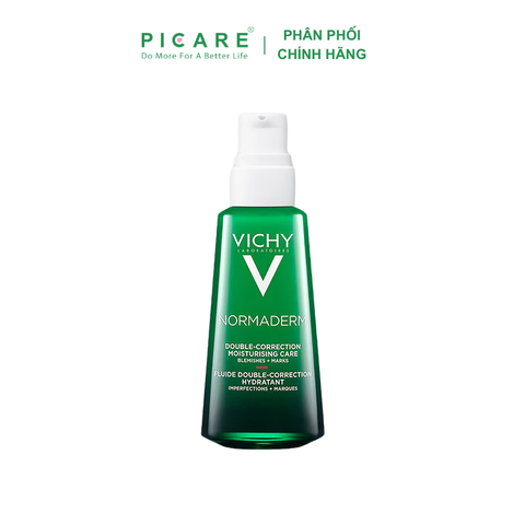 Vichy Normaderm Phytosolution Double-Correction Daily Care có thành phần hoạt tính hoàn toàn từ thiên nhiên, an toàn cho mọi loại da kể cả da nhạy cảm. Kết cấu kem mỏng nhẹ, thẩm thấu nhanh vào da, tác động trực tiếp vào nguyên nhân bệnh sinh mụn trứng cá, làm giảm mụn sưng viêm, mụn trứng cá và các đốm nâu sau mụn. Sản phẩm cũng cung cấp nước, độ ẩm, tái tạo củng cố hàng rào bảo vệ da, cải thiện sắc tố da mang đến làn da sáng mịn, đều màu. Lần đầu tiên, bạn sẽ tìm thấy một dòng kem trị mụn không hề nặng nề cho da, giúp việc loại bỏ mụn dễ dàng hơn bao giờ hết. - Picare là nhà phân phối chính hãng của Vichy tại Việt Nam.