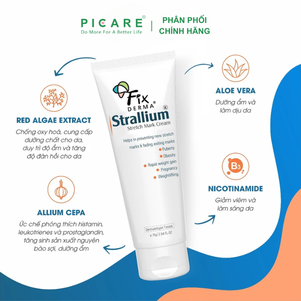 Fixderma Strallium Stretch Mark Cream là kem dưỡng chăm sóc chuyên biệt giúp làm mờ vết rạn da và cải thiện độ đàn hồi da hiệu quả, đặc biệt phù hợp cho phụ nữ mang thai, sau sinh hoặc người gặp tình trạng rạn da do tăng – giảm cân đột ngột. Sản phẩm chứa các chiết xuất tự nhiên lành tính như hành tây, bơ hạt mỡ, nha đam và vitamin C, giúp phục hồi làn da mềm mịn, khỏe mạnh mà không gây kích ứng – Picare là nhà phân phối chính hãng Fixderma tại Việt Nam.