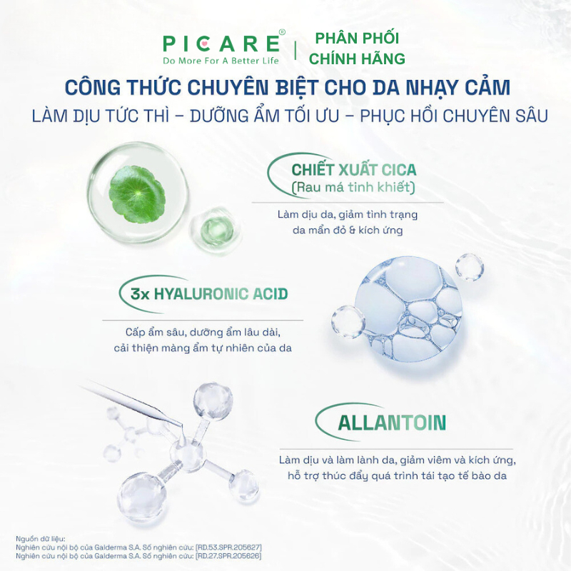 CICA (Centella Asiatica Leaf Extract): Giúp làm dịu da nhạy cảm, phục hồi mô tổn thương.
