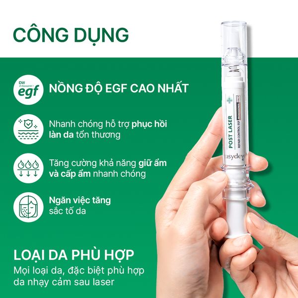 - Easydew EX Repair Control EGF là sản phẩm có hàm lượng EGF cao nhất trong dòng sản phẩm Easydew EX (10 ppm) nhanh chóng hỗ trợ phục hồi làn da thương tổn và hỗ trợ tái tạo da