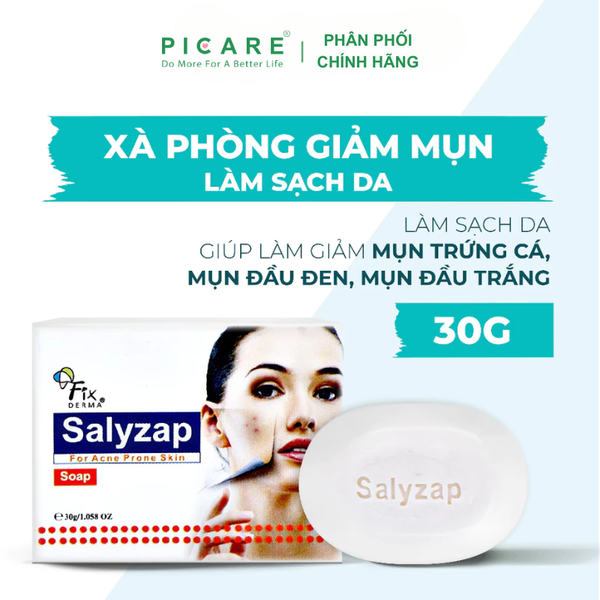 Fixderma Salyzap Soap là xà phòng chuyên biệt dành cho da mụn. Sản phẩm giúp làm sạch sâu, hỗ trợ giảm mụn trứng cá, mụn đầu đen, mụn đầu trắng và làm mờ các vết thâm sau mụn. Công thức kết hợp giữa hoạt chất kháng khuẩn và chống viêm, thích hợp cho làn da dầu, mụn và da dễ viêm nhiễm – Picare là nhà phân phối chính hãng của Fixderma tại Việt Nam.